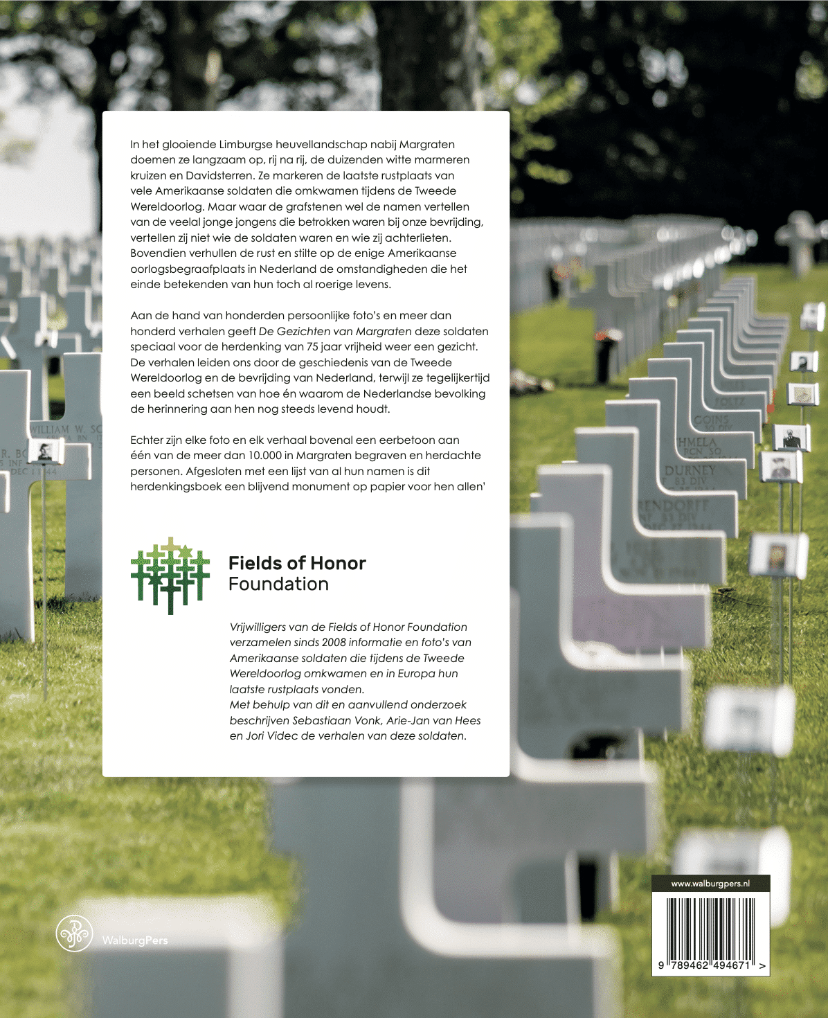 Vrijwilligers van de Fields of Honor Foundation verzamelen sinds 2008 informatie en foto’s van Amerikaanse soldaten die tijdens de Tweede Wereldoorlog omkwamen en in Europa hun laatste rustplaats vonden. Met behulp van dit en aanvullend onderzoek beschrijven Jori Videc, Sebastiaan Vonk en Arie-Jan van Hees de verhalen van deze soldaten. Het boek is in samenwerking met WalburgPers uitgegeven.